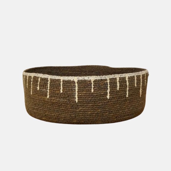 Cesto decorativo tejido a mano en fibras naturales, con un diseño contemporáneo en tono grise y detalle en color blanco. Perfecto para usar como frutero o para organizar objetos en la cocina o el salón, aportando un toque cálido y artesanal a los espacios modernos.