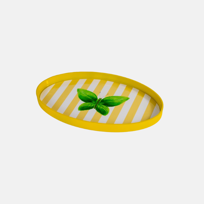Bandeja vaciabolsillos con fondo de color y estampado tipo collage. Perfecta tanto como bandeja como pieza decorativa: con sus colores vivos y motivos divertidos, aportará color y alegría a tu cocina y a tu hogar.