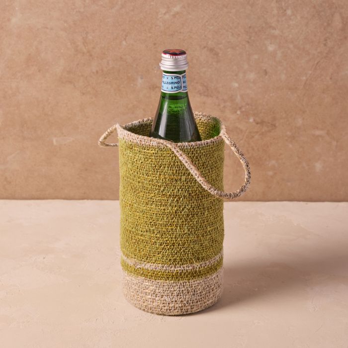 Porta botellas Hydra tejido a mano con algas marinas de origen ético y teñido artesanalmente en tonos tierra. Aporta un equilibrio perfecto entre estilo y calidez, con una estructura resistente que ayuda a evitar la aparición de moho, ideal para ambientes húmedos o reuniones al aire libre.