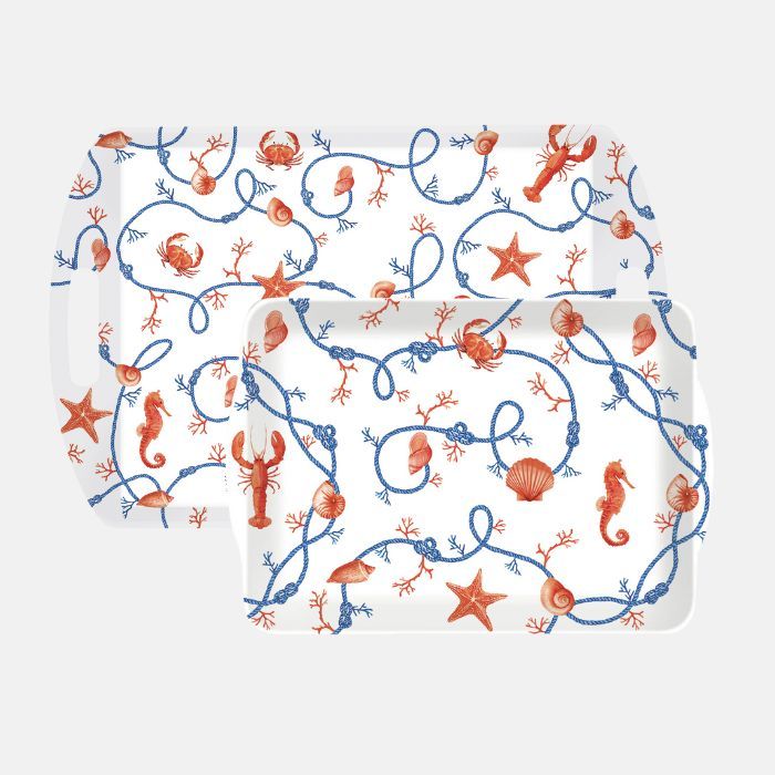 Tray set with maritime motifs pattern. 2 sizes available. They are not heavy as they are made of melamine.