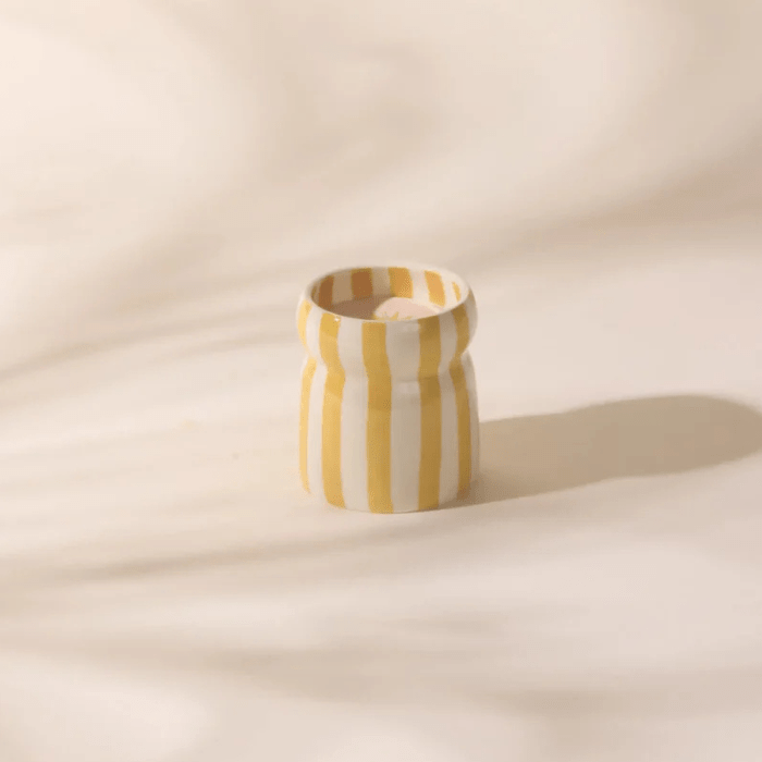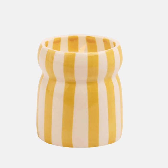 Estas velas pintadas a mano en Vietnam, están inspiradas en las sombrillas de rayas.Disponible en diferentes colores y olores.