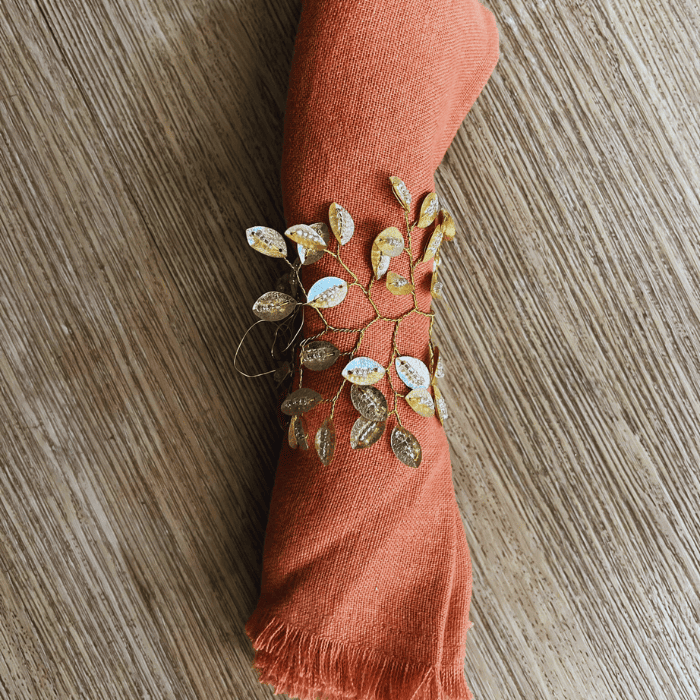 Elegante y sofisticado adorno de hojitas doradas para colgar del árbol. Sin embargo este gracioso adorno se puede transformar también en un bonito servilletero para tu mesa de navidad. Gracias a los alambres de latón que lo compone es fácilmente flexible.