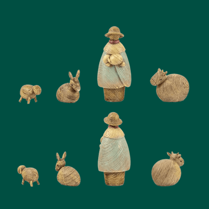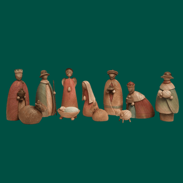 Compuesto por 11 piezas de madera, incorpora las figuras de un pesebre tradicional pero con un diseño elegante y alternativo. Se compone por las siguientes piezas: San José, la Virgen, el niño, el ángel,la mula, el buey, un pastor, una oveja, Melchor , Gaspar y Baltasar.