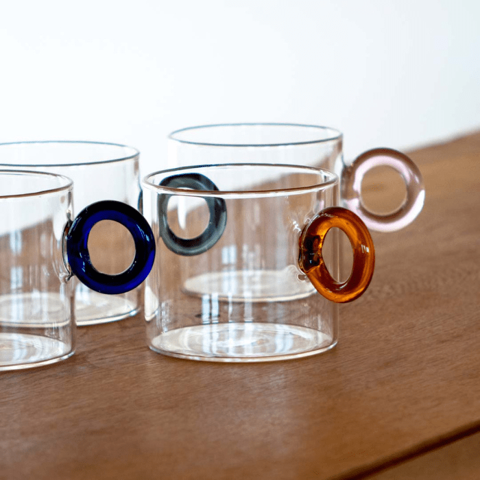 Set de 4 tazas de té de vidrio de borosilicato con asa circular de color.