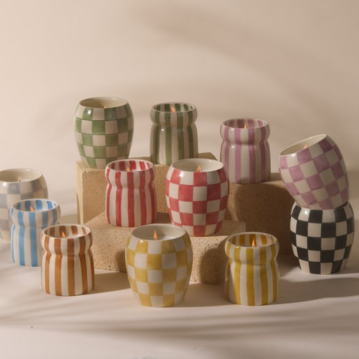 Las velas perfumadas Checkmate reúnen tres de nuestras cosas favoritas: estampados divertidos, colores vibrantes y funcionalidad. Pintados a mano e inspirados en las tendencias de diseño moderno, estos recipientes se rellenan con 11 oz de una fragancia espectacular. Cuando se acabe la cera de soja, reutiliza los tarros como jarrón u otro elemento de decoración para el hogar.