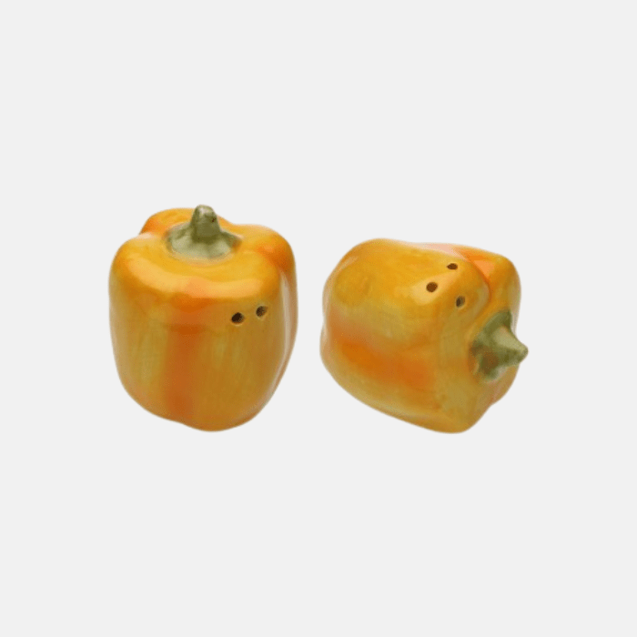 Salero y pimentero con forma de pimiento, elaborados en cerámica esmaltada. Su diseño detallado y natural aporta un toque original y encantador a la mesa. Perfectos para el día a día o para acompañar una mesa especial, combinan funcionalidad y estilo con un guiño a la huerta.