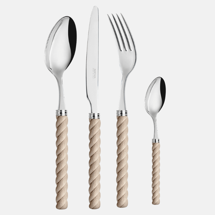 Cubertería con mango imitando a una cuerda marinera se compone de 1 cuchara mesa, 1 tenedor mesa, 1 cuchillo mesa,1 cuchara postre, 1 tenedor postre y 1 cuchillo de postre.